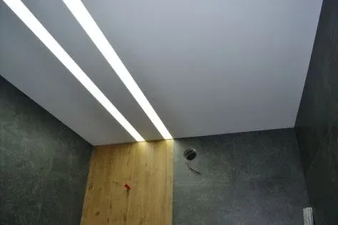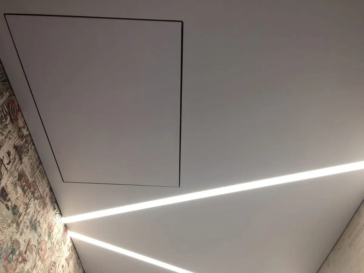 Специальный профиль, встраиваемый в натяжной потолок, позволяет создавать светящиеся геометрические фигуры, линии и кривые.