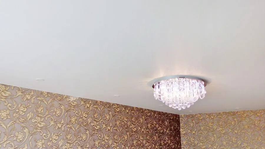 Сатиновые натяжные потолки имеют гладкую поверхность с легким жемчужным блеском.